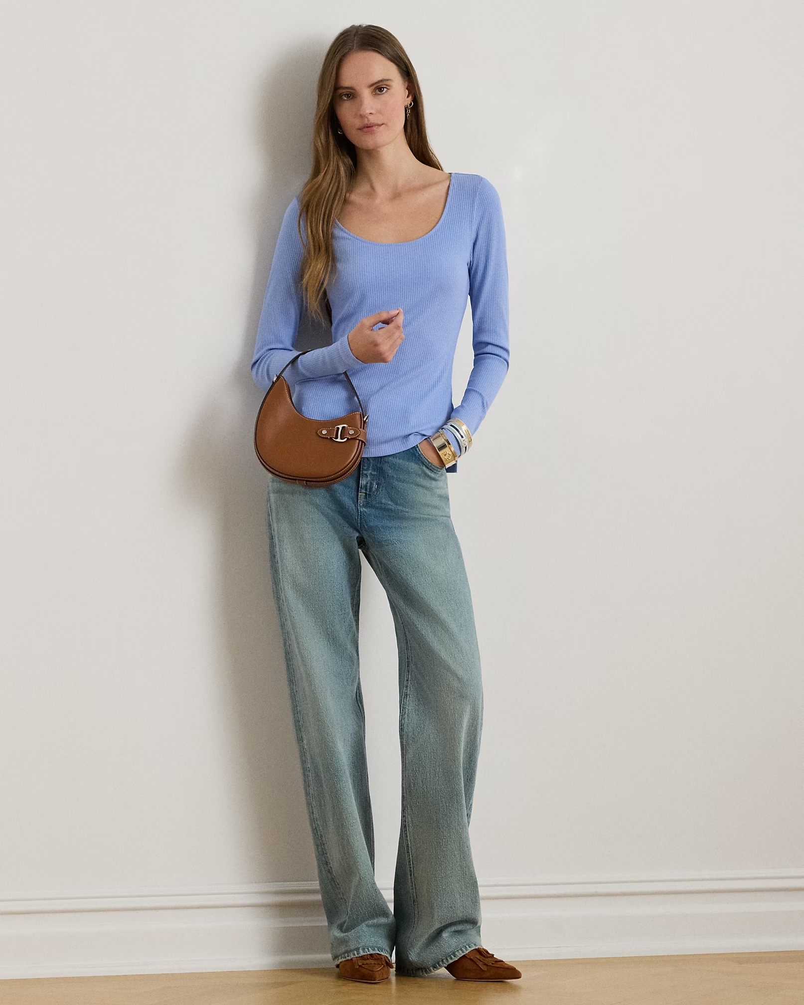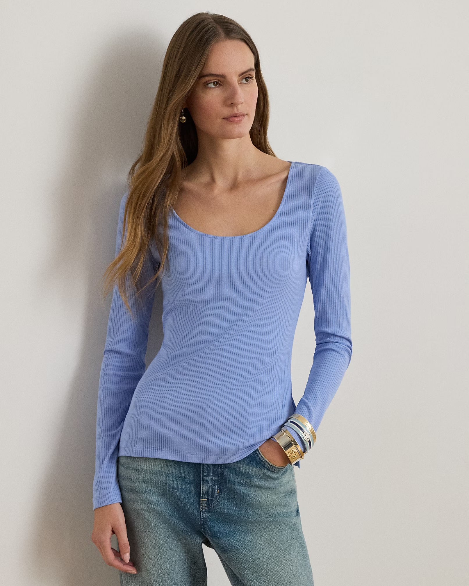 Rib-Knit Long-Sleeve Scoopneck Tee