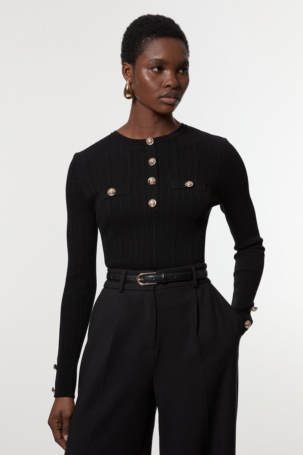 Military Trim Rib Long Sleeve Knit Top